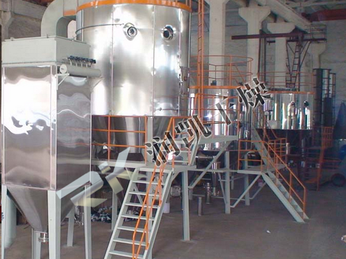 系統(tǒng)工作原理:空氣經(jīng)過濾和加熱,進(jìn)入干燥器頂部空氣分配器,熱空氣呈螺旋狀均勻地進(jìn)入干燥室。料液經(jīng)塔體頂部的高速離心霧化器,(旋轉(zhuǎn))噴霧成極細(xì)微的霧狀液珠,與熱空氣并流接觸在極短的時(shí)間內(nèi)可干燥為成品。成品連續(xù)地由干燥塔底部和旋風(fēng)分離器中輸出,廢氣由風(fēng)機(jī)排空。