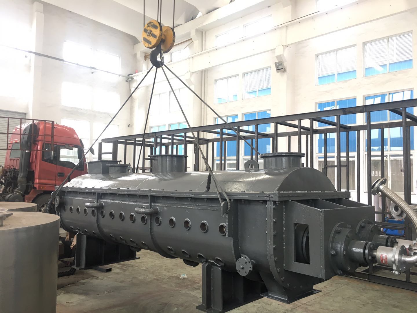 a.設(shè)備結(jié)構(gòu)緊湊,裝置占地面積小。由設(shè)備結(jié)構(gòu)可知,干燥所需熱量主要是由排列于空心軸上的空心槳葉壁面提供,而夾套壁面的傳熱量只占少部分。所以單位體積設(shè)備的傳熱面大,可節(jié)省設(shè)備占地面積,減少基建投資。