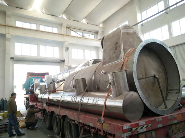 某環(huán)保科技有限公司訂購(gòu)的一臺(tái)8*0.8型號(hào)的振動(dòng)流化床已發(fā)運(yùn)!此套振動(dòng)流化床包含了進(jìn)料、熱風(fēng)、干燥、尾氣處理、冷卻等系統(tǒng)。在細(xì)節(jié)方面,干燥機(jī)下箱體分室制作,干燥段、加熱段和冷風(fēng)段分隔,且在烘干區(qū)和冷卻區(qū)分別設(shè)有清理口,便于清理落料;在材質(zhì)上,設(shè)備與物料接觸部件材質(zhì)為316L不銹鋼。